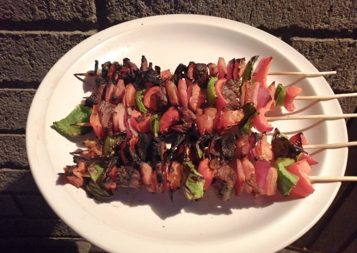 - Armar las brochetas con la carne, vegetales y tocino.