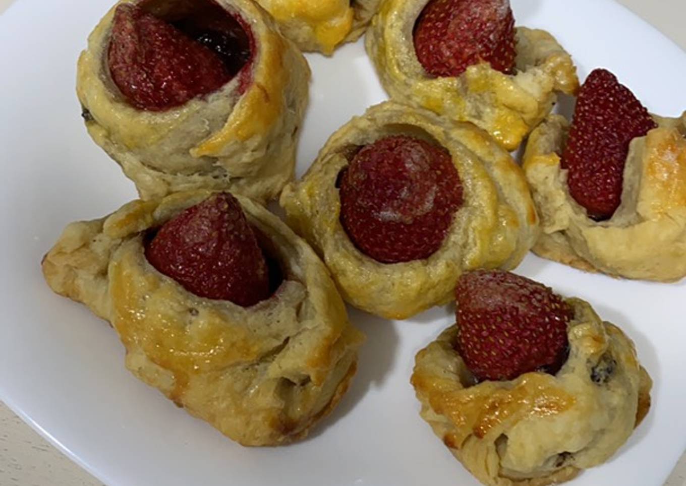 - Con la masa sobrante o con la que tengas, corta cuadrados, une dos lados para formar un cono, coloca las chispas de chocolate y la fresa con el tallo hacia adentro, envuelve con la misma masa