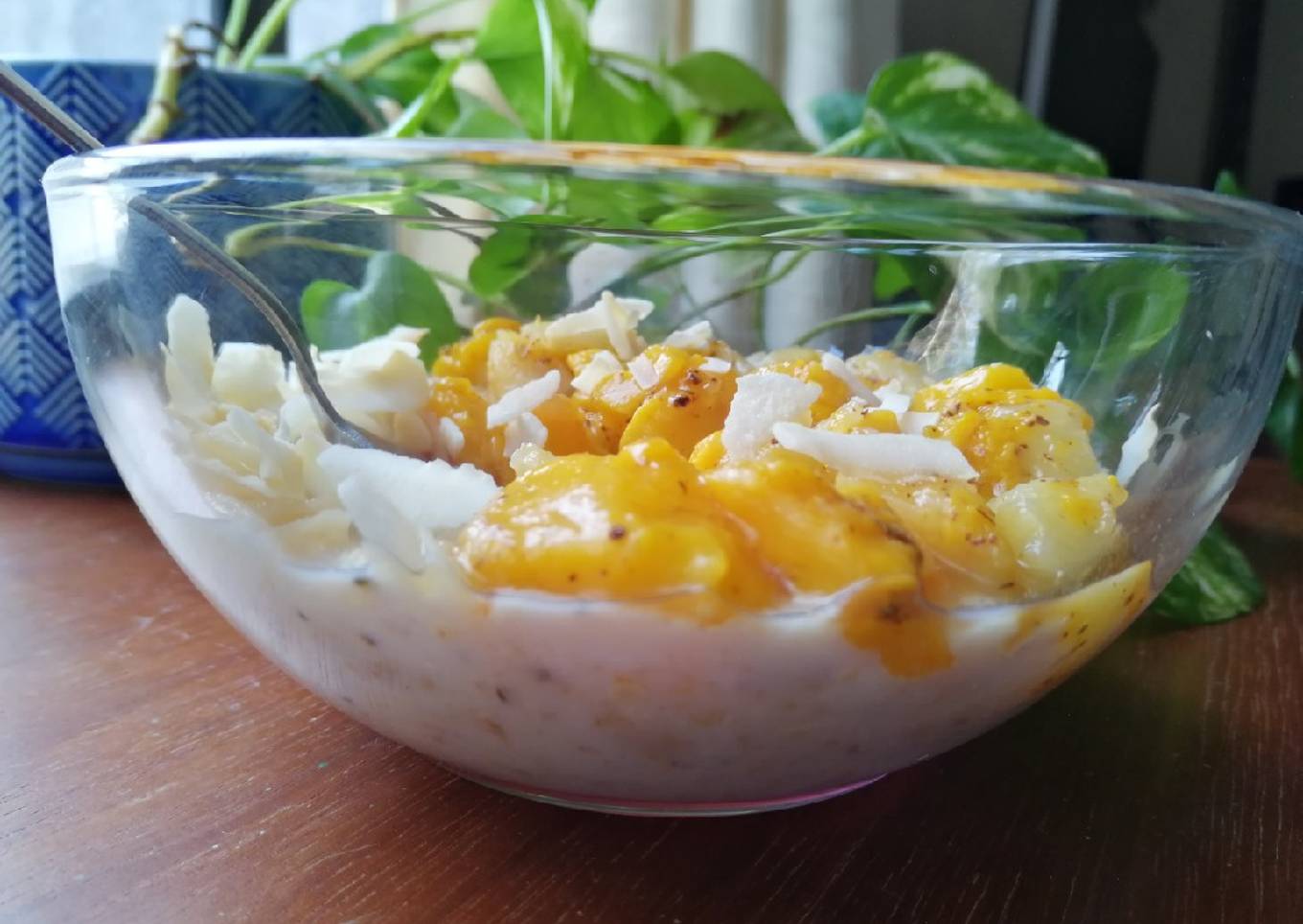 Rico rico desayuno y con las frutas de temporada, de hecho de mis desayunos favoritos cuando coinciden el mango y la piña... Puede comerse frío o caliente... El topping puede comerse también con yogurt o solito, como postre. #desayuno