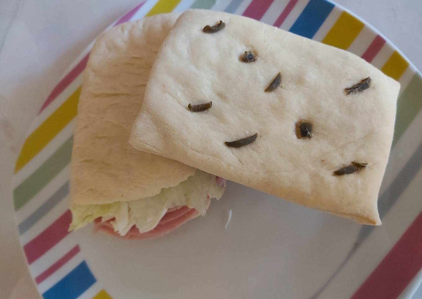 - Fermentar hasta duplicar el tamaño de la masa, porcionar. Dar forma de ciabatta (como un pequeño rectángulo de masa) y decorar con las aceitunas verdes fileteadas.