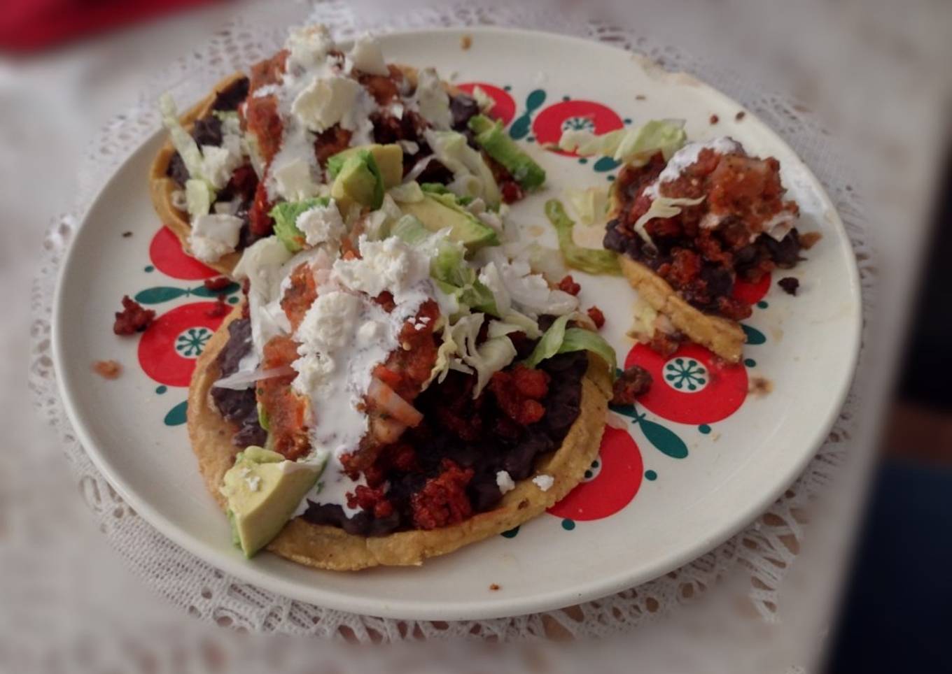 Sopes de frijoles con longaniza, y una rica salsa roja